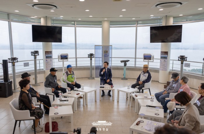 [서울=뉴스핌] 이재명 대통령이 3일 인천 강화군 강화평화전망대에서 실향민과 대화를 나누고 있다. [사진=대통령실] 2025.10.03 photo@newspim.com |