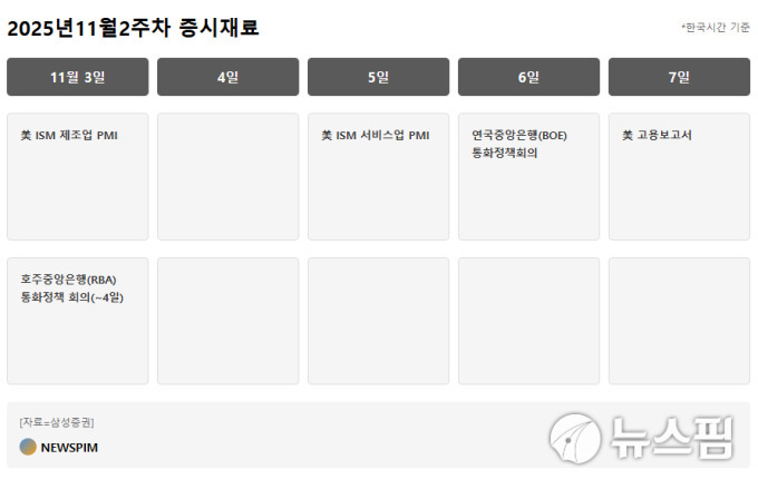 한편 중국은 9일 발표한 CPI·PPI를 시작으로 14일 소매판매와 산업생산 등 주요 지표를 공개할 예정이다. 구조적 디플레이션이 지속되는 가운데 지표 개선 여부에 따라 증시에 단기 모멘텀이 형성될 가능성이 있다. 이번 주에는 광군제(11일)와 AI 슈퍼컴퓨팅포럼(16~20일) 등 이벤트도 예정돼 있다.