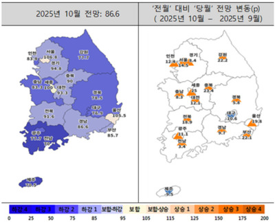 비수도권은 전월 대비 18.5p 하락한 66.3으로 전망됐다. 광역시는 16.0p 하락한 73.8로 전망됐으며 도지역 역시 20.3p 하락해 60.7로 전망됐다.