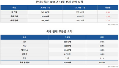 현대차에 따르면 11월 국내 판매는 6만1008대로 전년 동월 대비 3.4% 줄었다. 같은 기간 해외 판매는 28만8499대로 2.2% 감소했다.