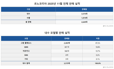 11월 내수 실적은 중형 SUV '그랑 콜레오스'가 사실상 전체 판매를 이끌었다. 그랑 콜레오스는 한 달 동안 2403대가 판매됐고, 이 가운데 2052대가 하이브리드 E-Tech 모델로 집계되면서 전체 그랑 콜레오스 판매의 85.4%를 차지했다.