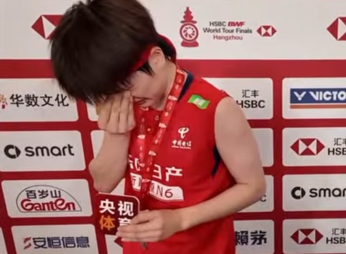 | [서울=뉴스핌] 박상욱 기자 = 왕즈이가 지난 21일 왕중왕전 결승에서 안세영에게 진 뒤 믹스트존에서 눈물을 쏟고 있다. [사진=CGTNSports SNS 동영상 캡처] 2025.12.23 psoq1337@newspim.com |