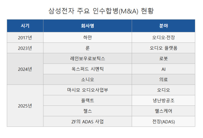 삼성전자의 최근 M&A 흐름은 전장에만 국한되지 않는다. 올해 들어 ▲독일 냉난방공조(HVAC) 기업 플랙트그룹 ▲미국 마시모 오디오 사업부 ▲미국 디지털 헬스 플랫폼 기업 젤스(Xealth) 등을 잇달아 인수했다. 사업 영역은 다르지만 모두 기존 주력 사업과의 시너지와 중장기 성장성을 고려한 선택이라는 공통점이 있다.