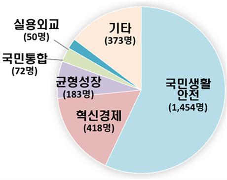 늘어나는 인력은 분야별로 국민생활안전 1454명, 혁신경제 418명, 균형성장 183명, 국민통합 72명, 실용외교 50명, 기타 373명 등 총 2550명이다.