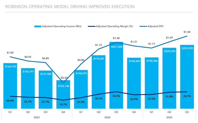 C.H. 로빈슨은 실적 발표와 함께 생산성 향상과 시장 점유율 확대를 근거로 2026년 영업이익 전망치를 약 5000만 달러 상향 조정했다.