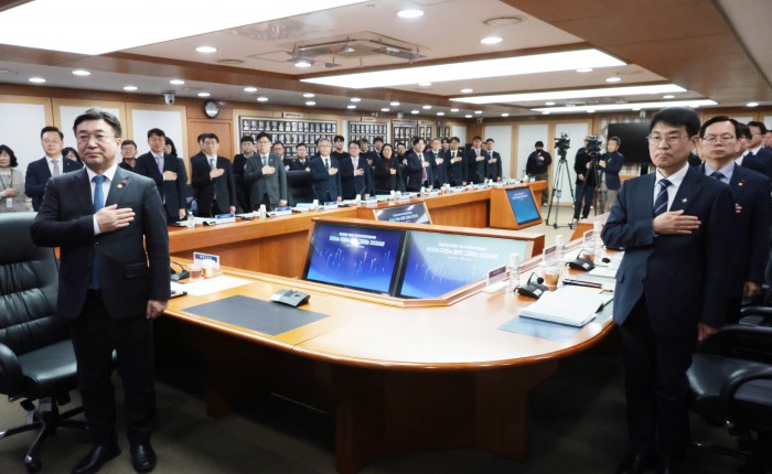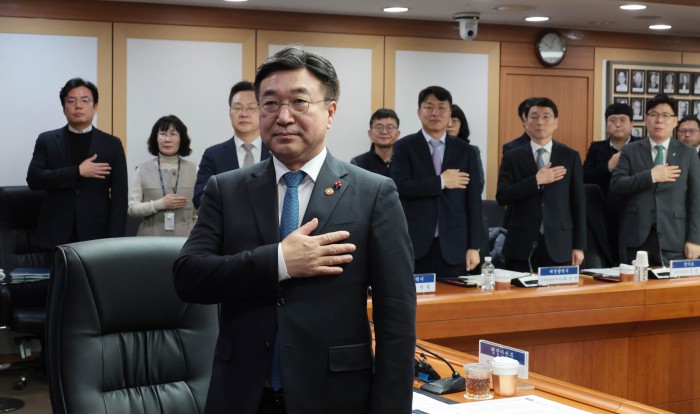 [서울=뉴스핌] 이길동 기자 = 윤호중 행정안전부 장관이 24일 서울 종로구 정부서울청사에서 열린 제8회 중앙지방정책협의회에서 참석자들과 국기에 경례하고 있다. 2025.12.24 gdlee@newspim.com
