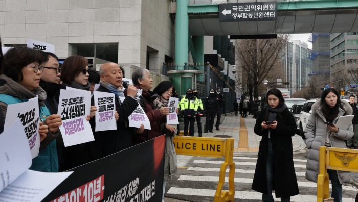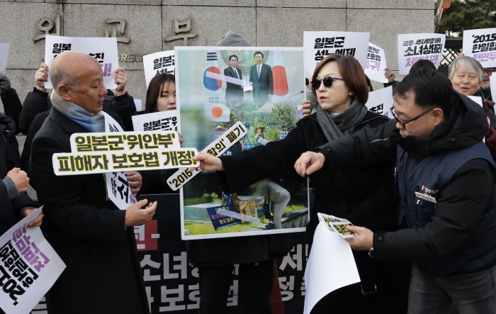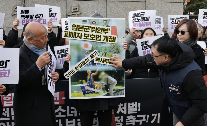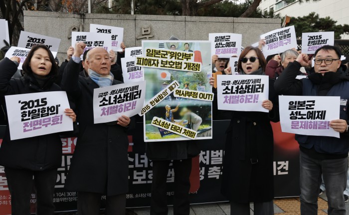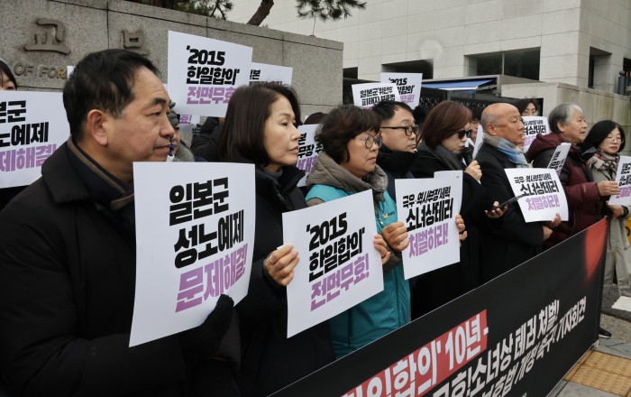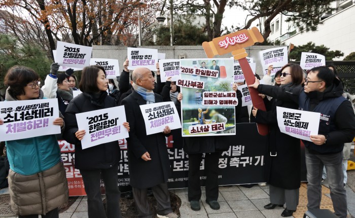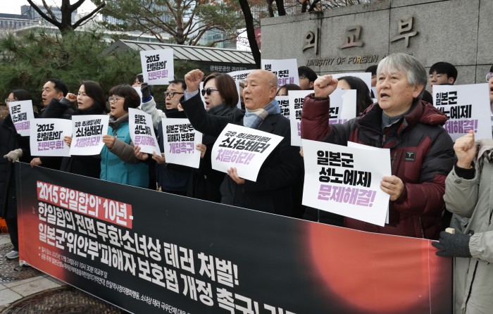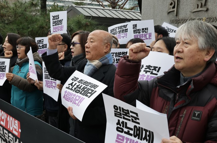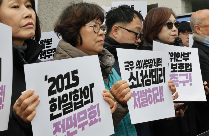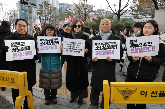 [서울=뉴스핌] 양윤모 기자 = 2015년 한일 일본군 '위안부' 합의가 체결된 지 10년을 앞둔 24일 오전 정의기억연대와 한일역사정의평화행동 등 시민단체 회원들이 서울 종로구 외교부 앞에서 한일합의 전면 무효·소녀상 테러 처벌·일본군 위안부 피해자 보호법 개정 촉구 기자회견를 개최후 피켁을 들고 있다. 2025.12.24 yym58@newspim.com