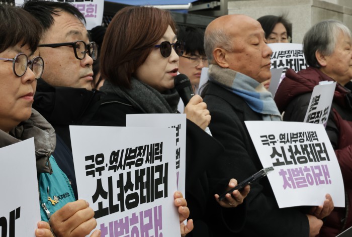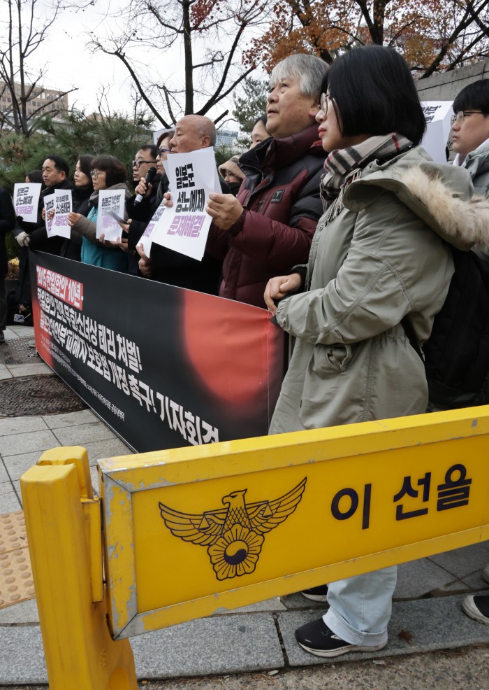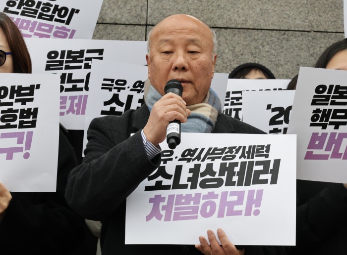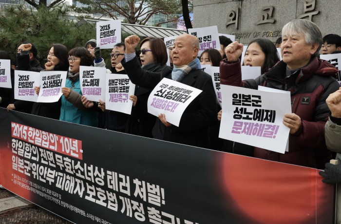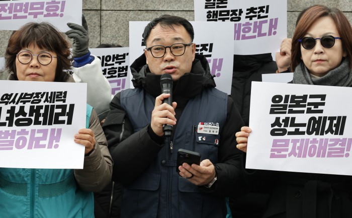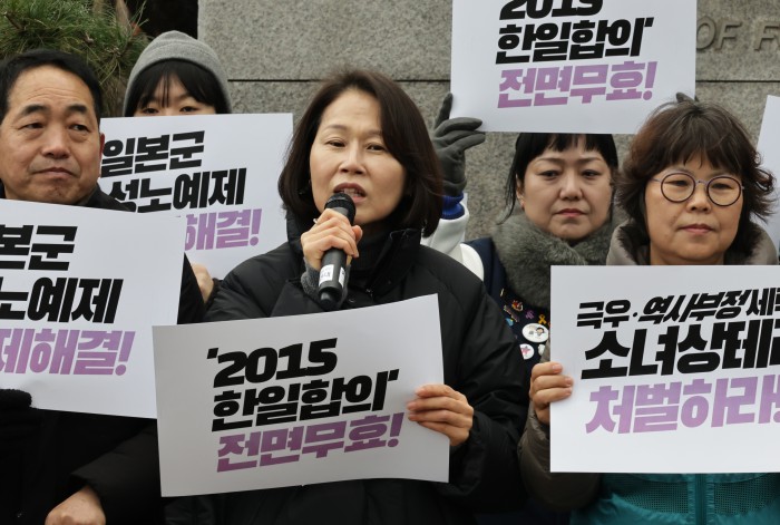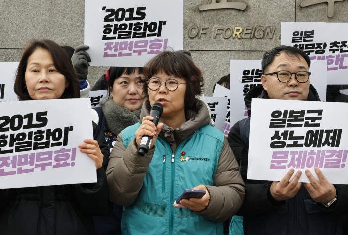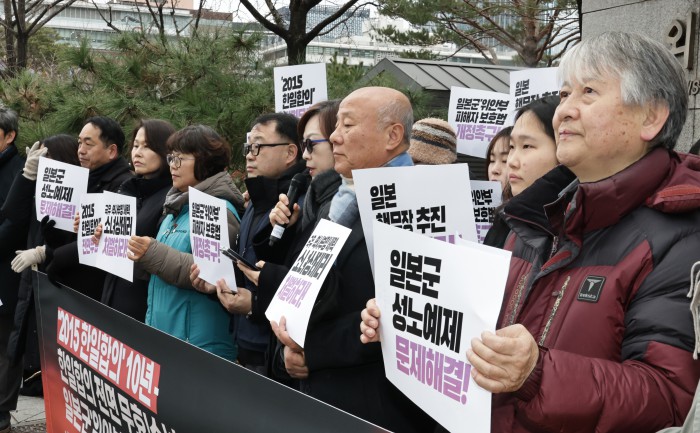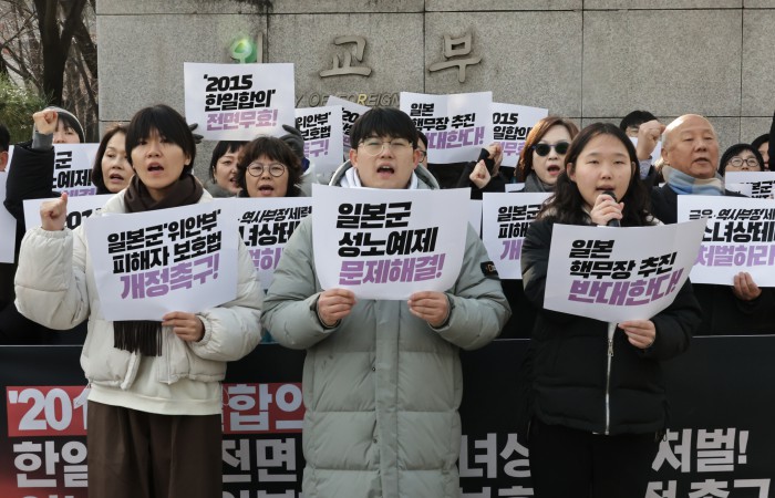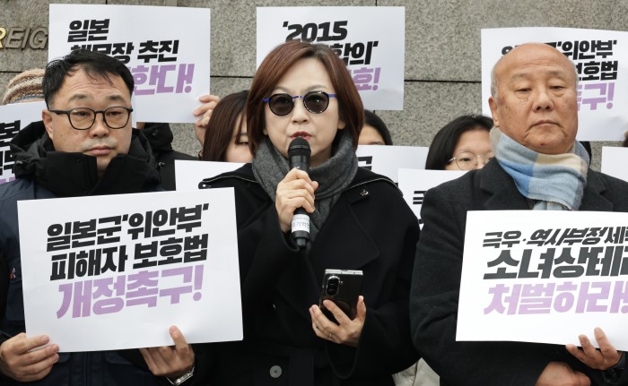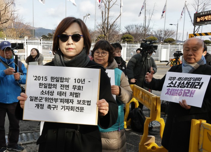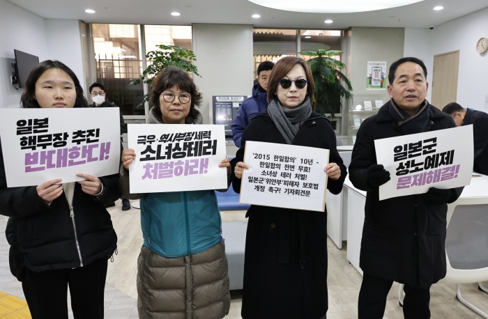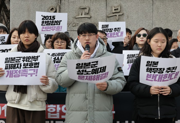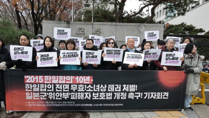 [서울=뉴스핌] 양윤모 기자 = 2015년 한일 일본군 '위안부' 합의가 체결된 지 10년을 앞둔 24일 오전 정의기억연대와 한일역사정의평화행동 등 시민단체 회원들이 서울 종로구 외교부 앞에서 한일합의 전면 무효·소녀상 테러 처벌·일본군 위안부 피해자 보호법 개정 촉구 기자회견를 개최하고 있다. 2025.12.24 yym58@newspim.com