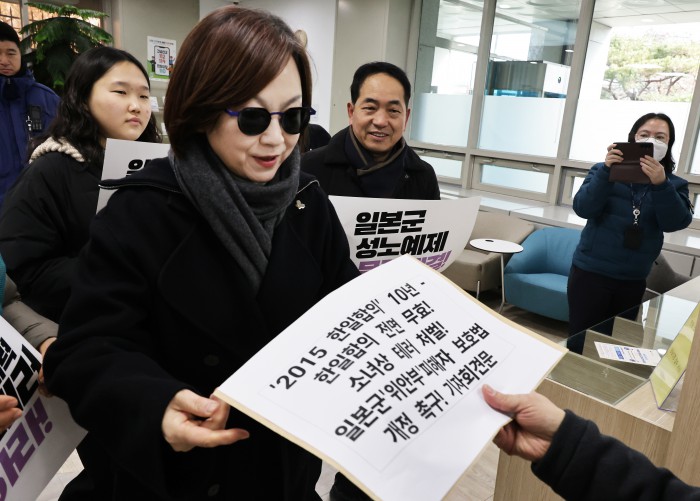 [서울=뉴스핌] 양윤모 기자 = 2015년 한일 일본군 '위안부' 합의가 체결된 지 10년을 앞둔 24일 오전 정의기억연대와 한일역사정의평화행동 등 시민단체 회원들이 서울 종로구 외교부 앞에서 한일합의 전면 무효·소녀상 테러 처벌·일본군 위안부 피해자 보호법 개정 촉구 기자회견를 개최후 이나영 정의기역연대 이사장이 문서를 외교부에 두손으로 전달하자 외교부 직원은 한손으로 받고 있다. 2025.12.24 yym58@newspim.com