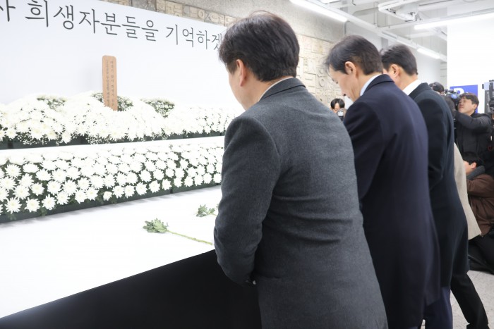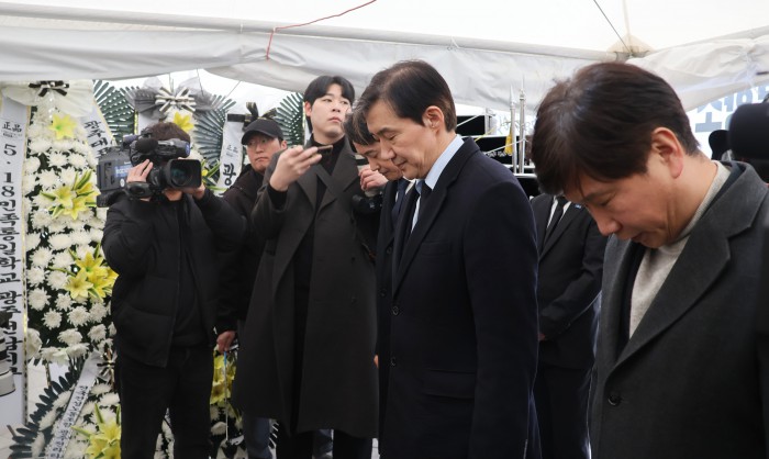 조국 조국혁신당 대표가 24일 오후 광주 전일빌딩 1층에 마련된 12·29여객기 참사 1주기 추모 분향소를 찾아 참배하고 있다.