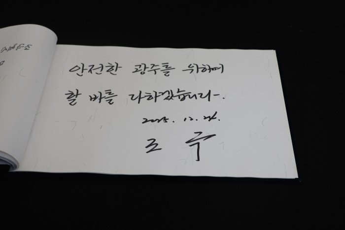 [광주=뉴스핌] 박진형 기자 = 조국 조국혁신당 대표가 24일 오후 광주 동구 5.18민주광장에 마련된 광주대표도서관 붕괴 참사 희생자 시민분향소를 방문한 뒤 작성한 방명록. '안전한 광주를 위하여 할 바를 다하겠습니다'고 쓰여 있다. 2025.12.24 bless4ya@newspim.com