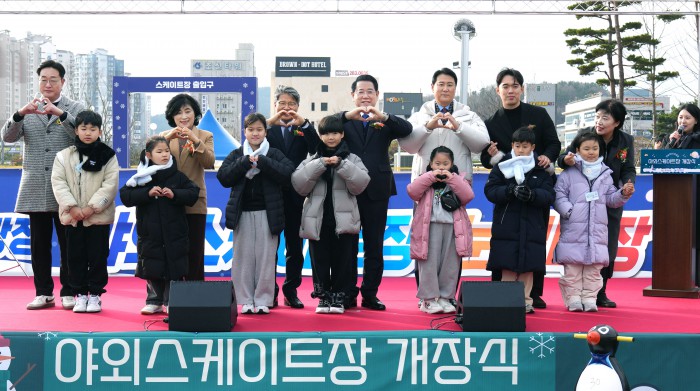 [무안=뉴스핌] 조은정 기자 = 김영록 전라남도지사가 24일 도청 전남OK도민광장에서 열린 ‘야외 스케이트장 개장식’에서 주요 내빈 및 어린이들과 스케이트를 타고 기념촬영을 하고 있다. [사진=전남도] 2025.12.24 ej7648@newspim.com