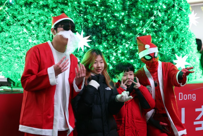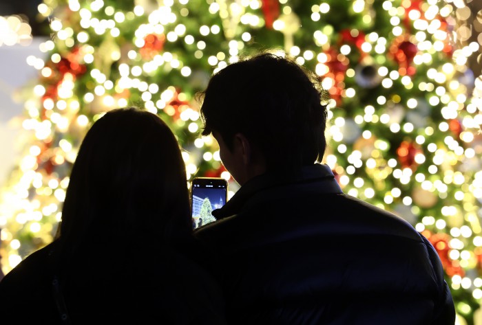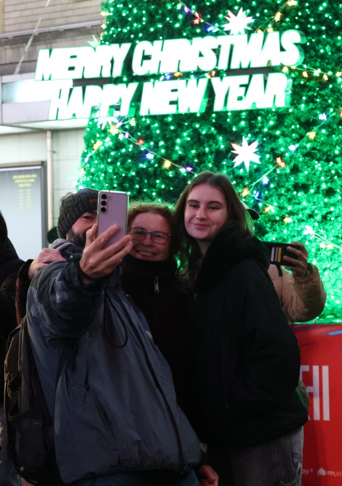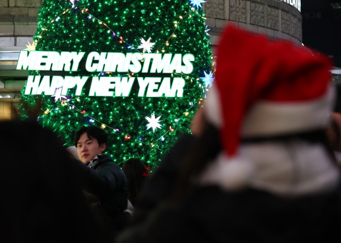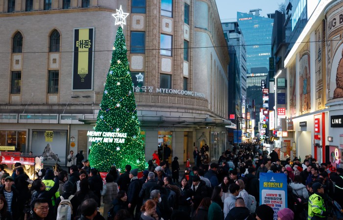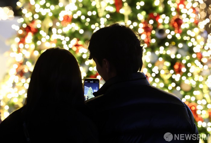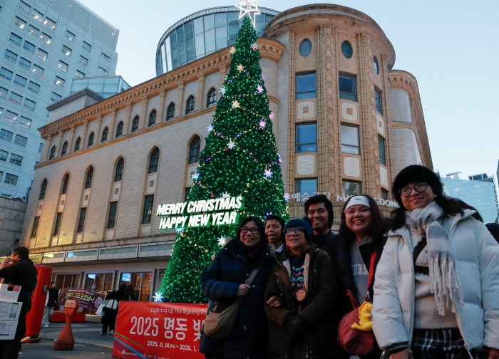 [서울=뉴스핌] 류기찬 기자 = 크리스마스 이브인 24일 오후 서울 중구 명동거리를 찾은 외국인 관광객들이 크리스마스 트리 앞에서 기념촬영을 하고 있다. 2025.12.24 ryuchan0925@newspim.com