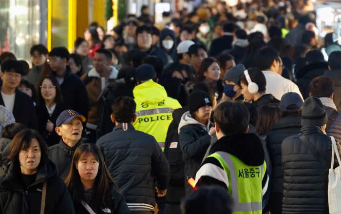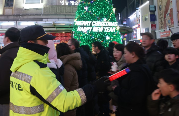 [서울=뉴스핌] 류기찬 기자 = 크리스마스 이브인 24일 오후 서울 중구 명동거리에서 서울 중구 관계자와 경찰 관계자들이 인파를 안전하게 통제하고 있다. 2025.12.24 ryuchan0925@newspim.com