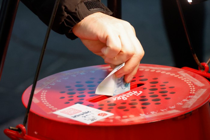 [서울=뉴스핌] 류기찬 기자 = 크리스마스 이브인 24일 오후 서울 중구 명동거리에서 한 시민이 구세군 자선냄비에 기부를 하고 있다. 2025.12.24 ryuchan0925@newspim.com