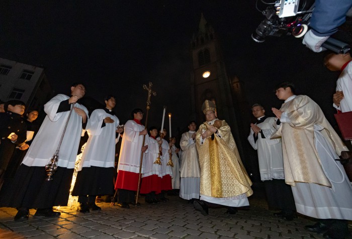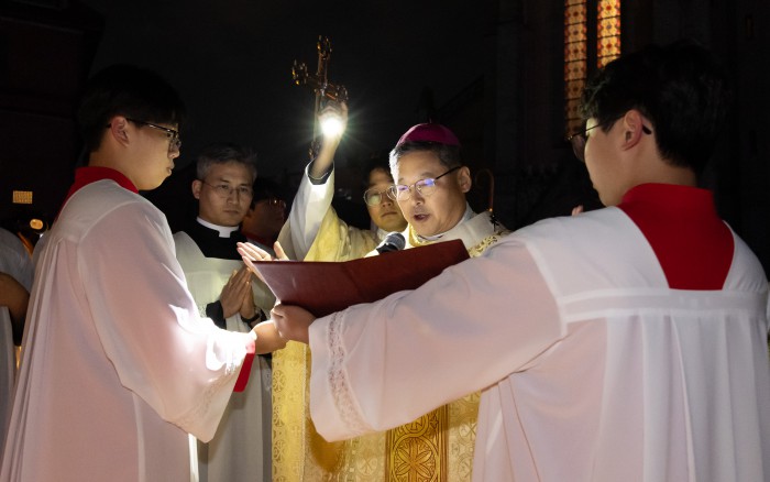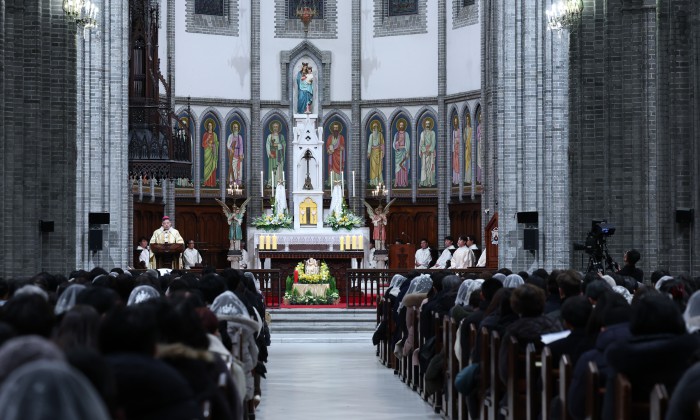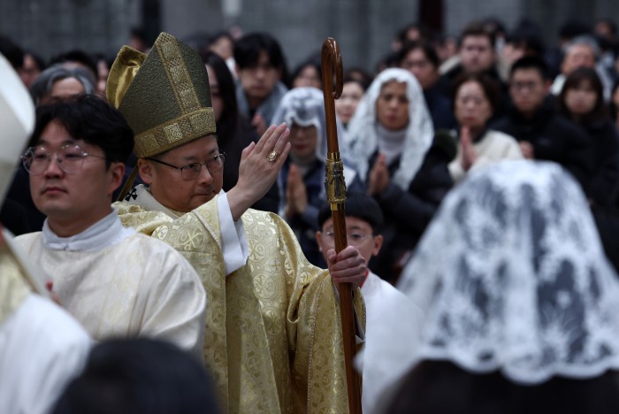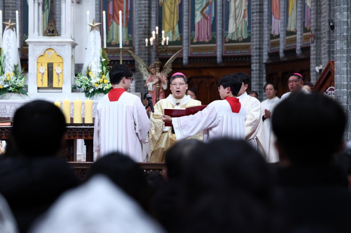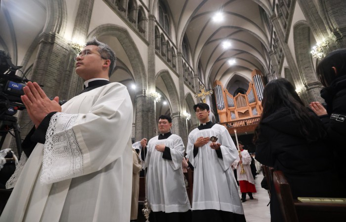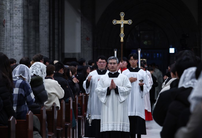 [서울=뉴스핌] 최지환 기자 = 성탄절인 25일 새벽 서울 중구 명동대성당에서 정순택 천주교 서울대교구 대주교의 주님 성탄 대축일 밤 미사 집전에 앞서 사제들이 입당하고 있다. 2025.12.25 choipix16@newspim.com