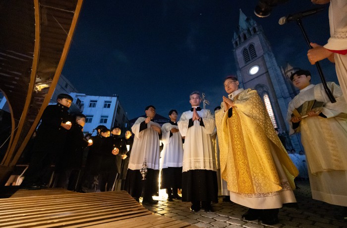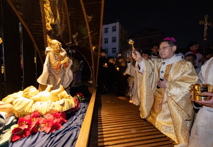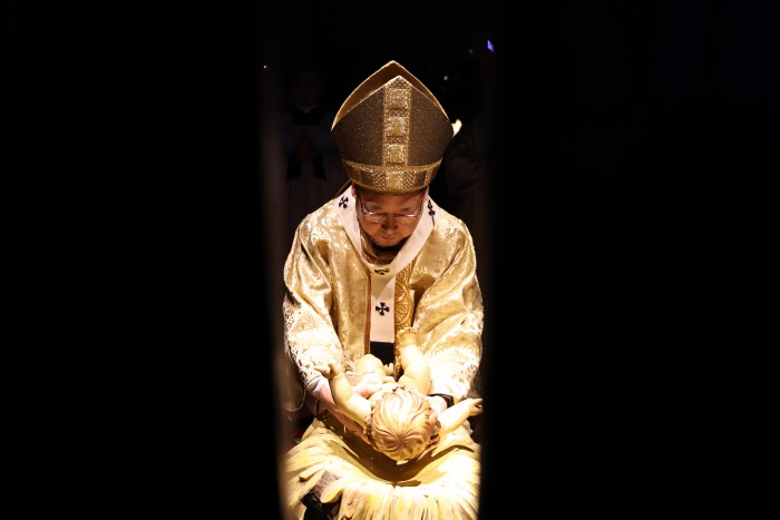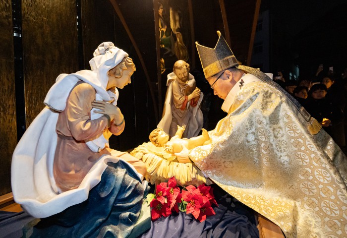 [서울=뉴스핌] 최지환 기자 = 천주교 서울대교구장 정순택 대주교가 25일 새벽 서울 중구 명동대성당 앞마당에서 아기 예수를 말 구유에 안치하는 '구유 예절' 의식을 행하고 있다. 2025.12.25 choipix16@newspim.com
