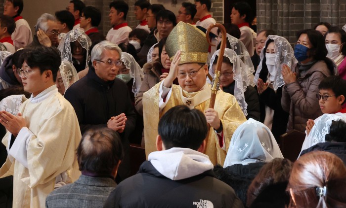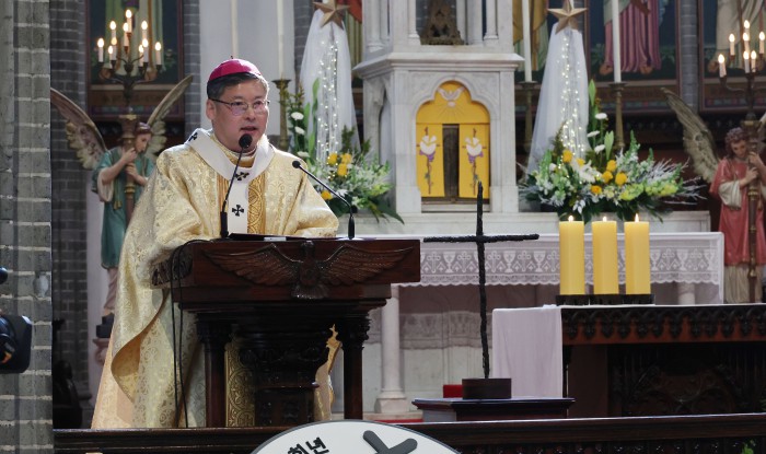 [서울=뉴스핌] 사진공동취재단 = 성탄절인 25일 서울 중구 명동대성당에서 성탄 대축일 낮 미사를 정순택 천주교 서울대교구 대주교가 집전하고 있다. 2025.12.25 photo@newspim.com