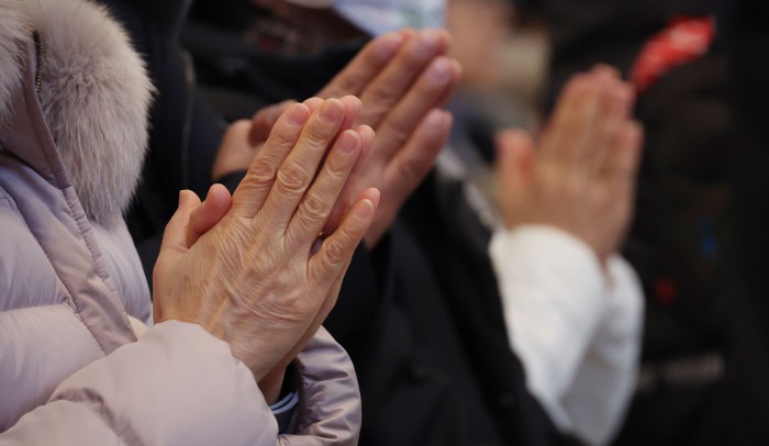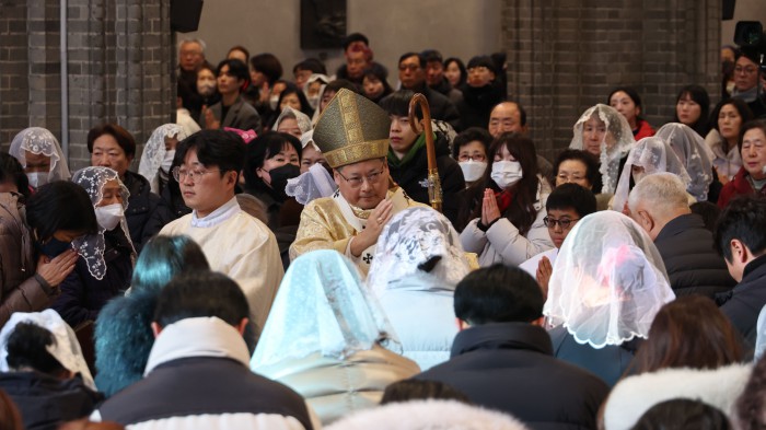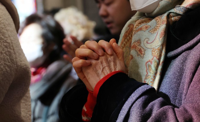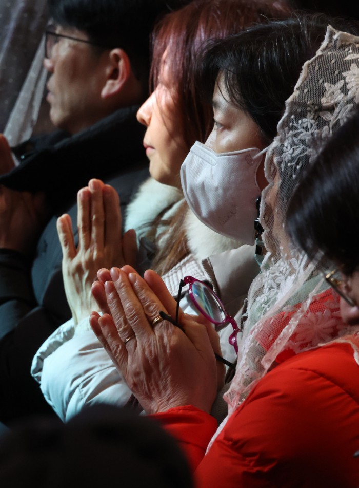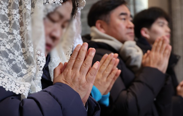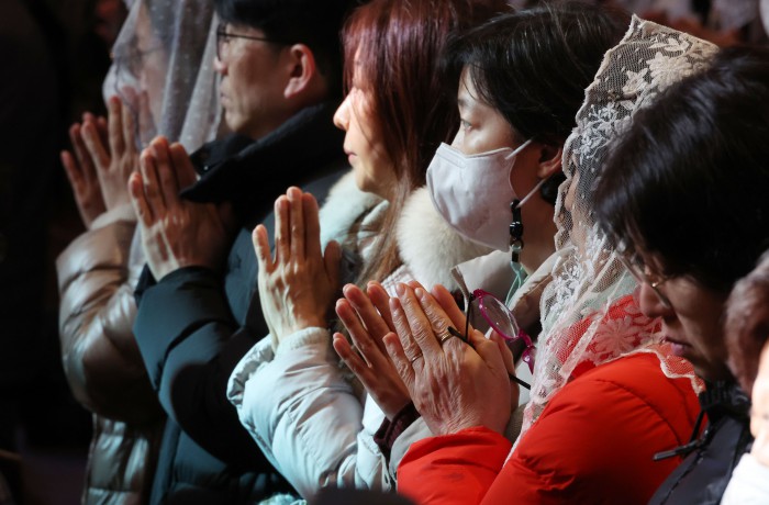 [서울=뉴스핌] 사진공동취재단 = 성탄절인 25일 서울 중구 명동대성당에서 열린 성탄 대축일 낮 미사에서 신도들이 기도 하고 있다. 2025.12.25 photo@newspim.com